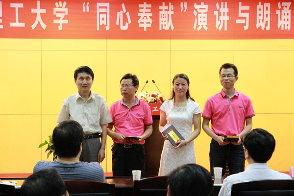 2012年5月31日下午,学校图书馆西会议室内洋溢着浓浓的深情,我校统一战线的广大成员满怀豪情,聚集一堂,各民主党派成员和无党派代表人士用激情四溢的演讲和声情并茂的朗诵,表达了诚挚的爱国主义情怀,颂扬了爱岗敬业的奉献精神,展示了博学多才的精神风貌。由党委统战部举办的统战成员“同心奉献”演讲与朗诵比赛取得了圆满成功。校党委副书记王洪观看了比赛,并为获得一等奖的选手和优秀组织奖的民主党派基层组织颁奖。