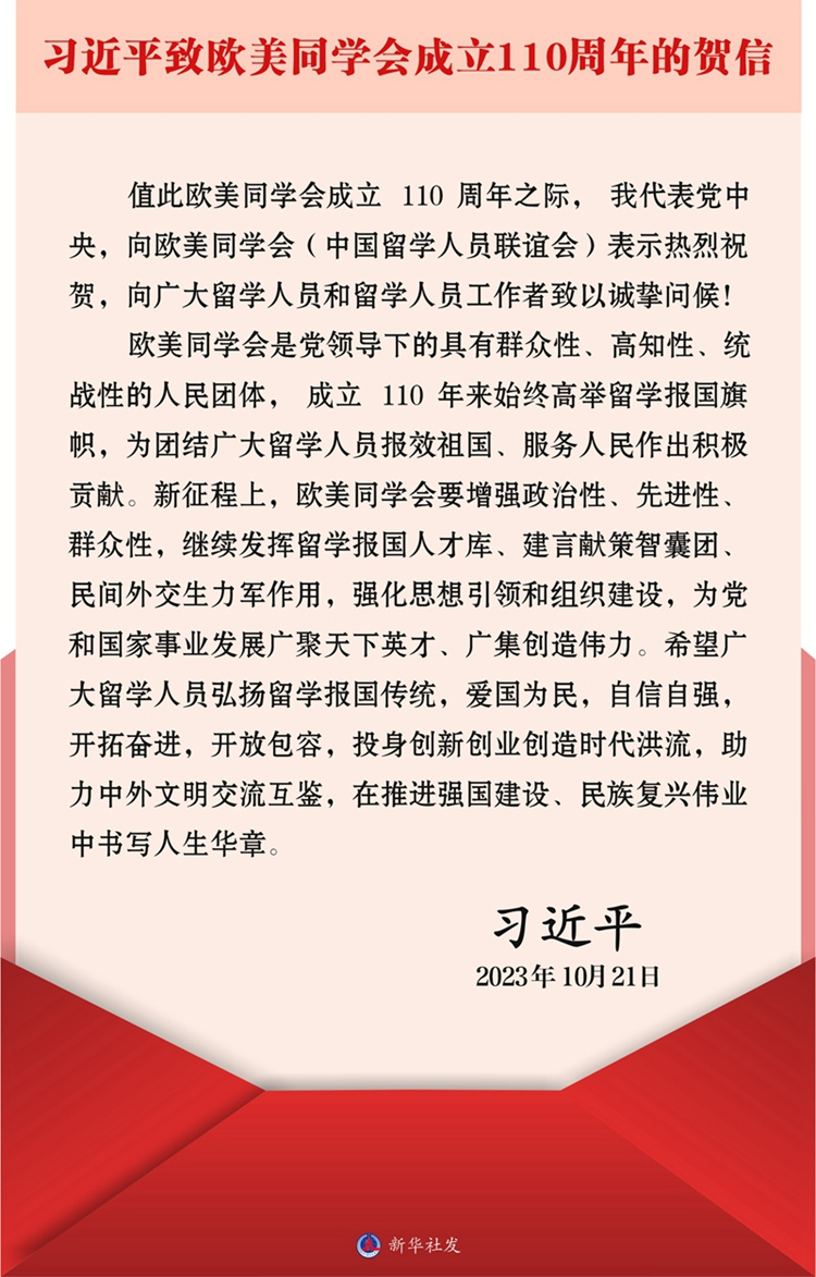 新华社北京10月21日电 在欧美同学会成立110周年之际,中共中央总书记、国家主席、中央军委主席习近平发来贺信,代表党中央向欧美同学会(中国留学人员联谊会)表示热烈祝贺,向广大留学人员和留学人员工作者致以诚挚问候。